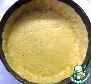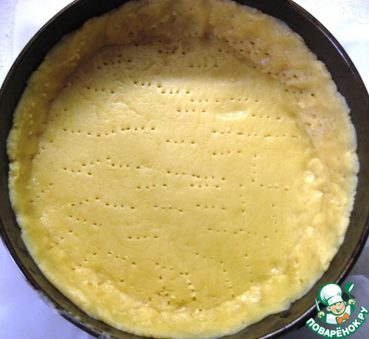 Достаем бОльшую часть теста из холодильника, раскатываем, переносим в форму (диаметр 20 см, дно я застелила пергаментом), формируя бортики 2-3 см. Накалываем вилкой по всей поверхности.