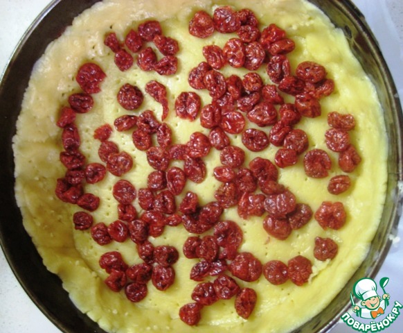 Вяленую вишню (можно и изюм, и курагу) залить горячей водой, дать постоять минут 15-20, затем воду слить, просушить ягоды бумажным полотенцем.