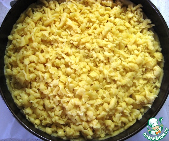 Достаем из холодильника меньшую часть теста, на крупной терке натереть поверх фруктов, полностью закрывая их.