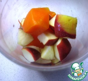 В чашу блендера сложить кусочки очищенной свежей тыквы и яблока.