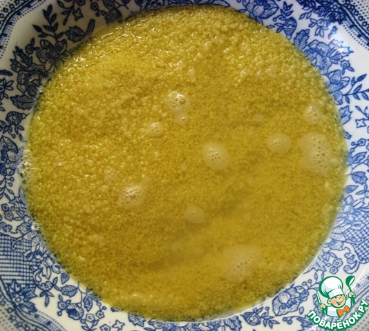 Кус-кус залить кипятком, накрыть крышкой и оставить на 5 минут.