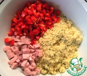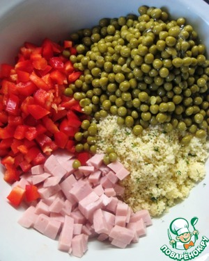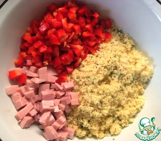 Соединить готовый кус-кус, нарезанную небольшими кубиками ветчину и болгарский перец.