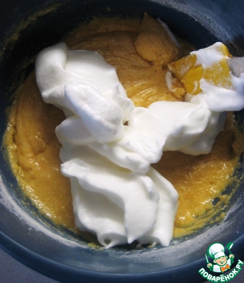 • Вынимаем белки из холодильника и взбиваем со щепоткой соли до устойчивых пиков. Добавляем взбитые белки к тесту. Несколькими движениям вмешиваем их в тесто, долго не перемешиваем.