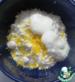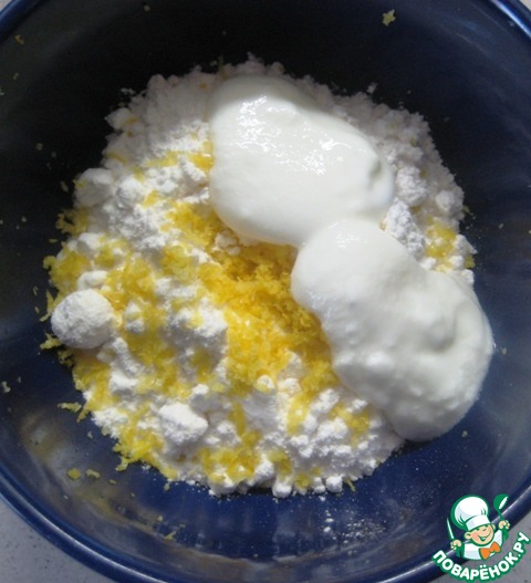 • Для глазури: тщательно смешиваем сахарную пудру, цедру из половины лимона и йогурт.