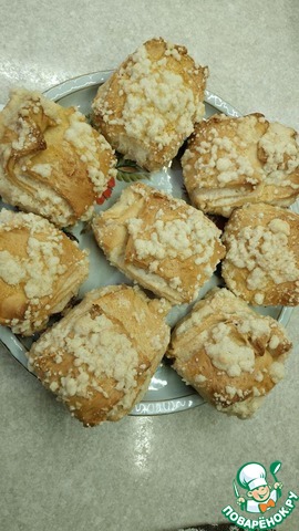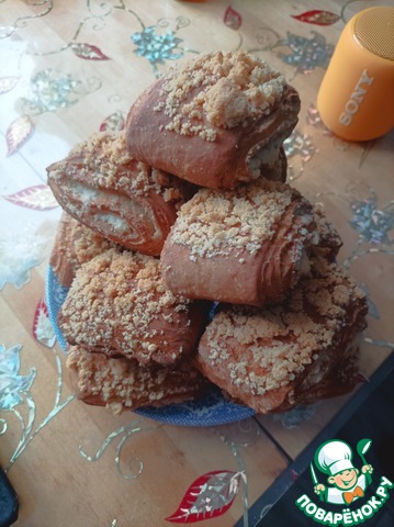 Немного внесла отсебятины: добавила в тесто ванилин и в оставшуюся крошку для посыпки верха слоек добавила измельчённые орехи.