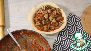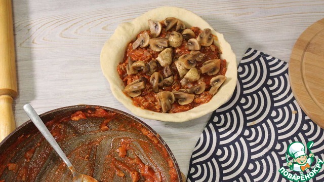 Раскатаем тесто до толщины примерно 1см. Форму с высокими бортиками смазываем растительным маслом и выкладываем тесто. Затем фарш, порезанные крупно грибы, моцареллу и твердый сыр, много сыра!