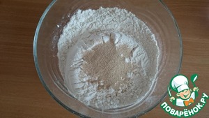 Перемешиваем сухие ингредиенты: муку, дрожжи, ванильный сахар, сахар, соль. -