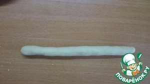 Готовое тесто обминаем и делим на 16 кусочков. Из каждого кусочка формируем колбаску примерно с палец толщиной.