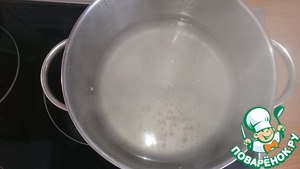 В кастрюлю наливаем оставшиеся 800 мл воды, доводим до кипения. Добавляем 2 ст. л. сахара и тонкой струйкой, постоянно помешивая, вводим раствор крахмала.
