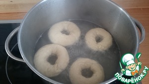 Варим баранки примерно 20 секунд. Потом вытаскиваем шумовкой и складываем на противень застеленный силиконовым ковриком или смазанный маслом.