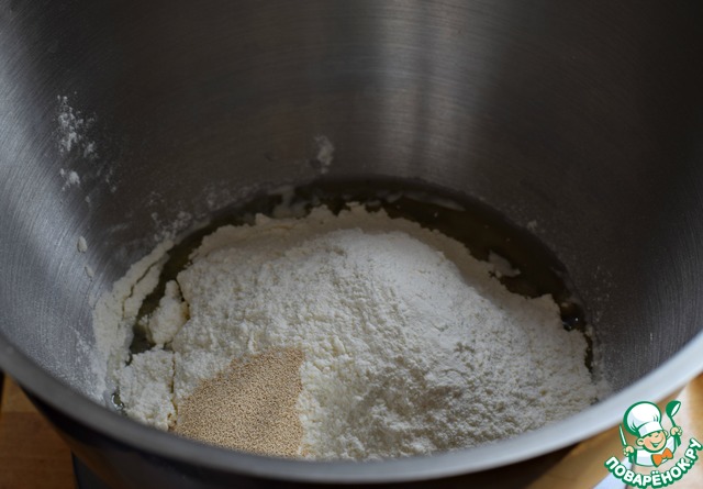 Муку просеять, смешать с солью, сахаром и дрожжами. Влить к сухим ингредиентам воду и кукурузное (подсолнечное рафинированное) масло. Замесить тесто. |