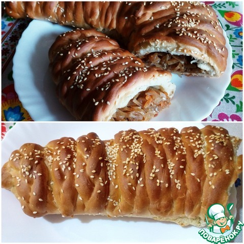 Описание: Сытный, ароматный, добротный такой пирог с луком и квашеной капустой. Сочная начинка, хрустящее тесто. Вкусно! Готовится совсем несложно и из самых доступных продуктов. А при такой оригинальной формовке этот пирог будет настоящим украшением стола. Попробуйте!