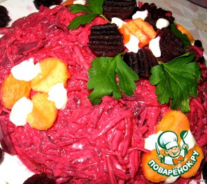 Всем известное и до боли знакомое сочетание витаминных свежих овощей - отварной свеклы, свежей ароматной сладкой морковочки и сочной хрустящей капустки... Но такой салатик я не очень люблю, да и королевского звания он вряд ли достоен... А вот если в салатик добавить соломку жареного картофеля, салатик кардинально преображается... Вкус становится ярче, насыщенней, прибавляется необычная пряность и какой-то неповторимый сливочный, что ли, вкус картофеля... если вы хоть раз в жизни пробовали салатик с жареным картофелем... то вы меня поймете...
