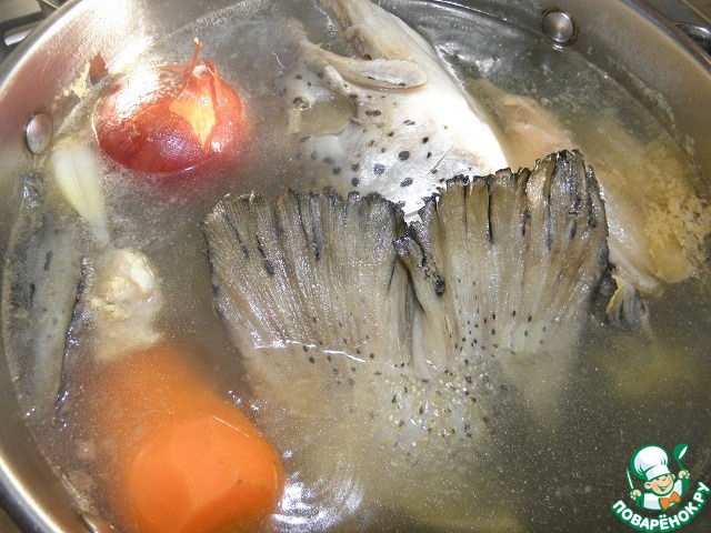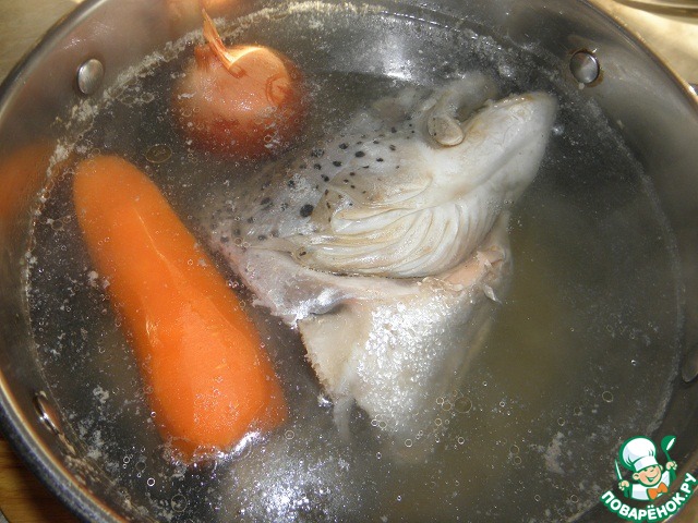 После замачивания кладем рыбные части именно в кипящую воду! И при умеренном кипении начинаем варить бульон, снимаем шумовкой пену.