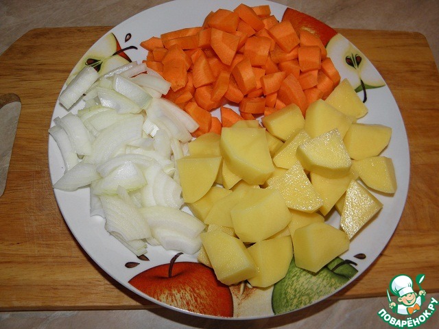 Пока варится бульон подготовим другие продукты: Лук репчатый (2я головка) очистим, нарежем, можно мельче, но я люблю в ухе среднюю нарезку, поэтому четверть кольца) морковь и картофель (кубиками) режем любым удобным для вас способом, но мельчить не стоит