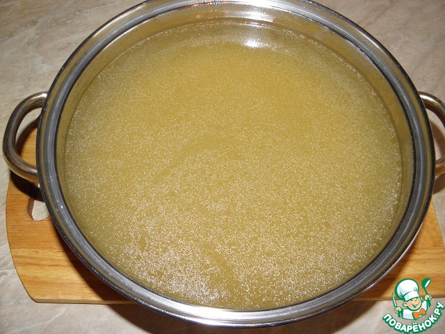 Варим бульон на несильном огне под неплотно закрытой крышкой в течение 20-30 минут, пока он не станет более-менее прозрачным ( средняя интенсивность огня, до прекращения образования пенных хлопьев)