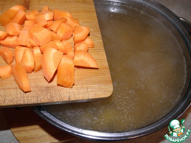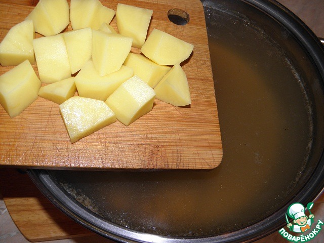 Бульон возвращаем на огонь и добавляем в него картошку. Доводим до кипения и варим при несильном кипении под неплотно закрытой крышкой в течение 7-10 минут.