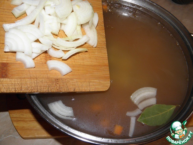 После того как убрали всю пену добавляем в бульон 1 целую морковку и 1 нечищеную головку лука