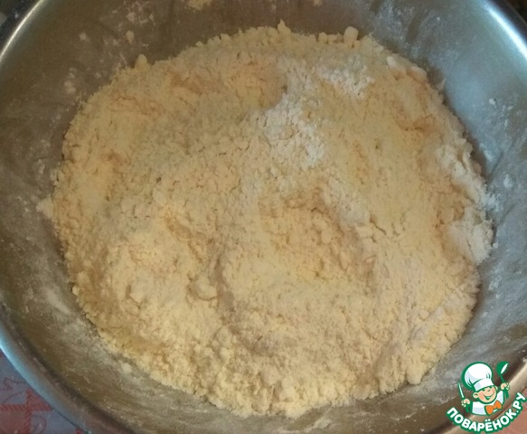 В миске смешать муку с разрыхлителем, сахар, ванилин и нарезанное кусочками холодное сливочное масло. Перетереть руками в крошку.