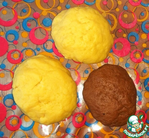 Разделить на 3 равные части. В одну часть подмешать 2 ст л какао и 1 ст л кефира. Положить все тесто в кулек в морозилку на 40 минут. -