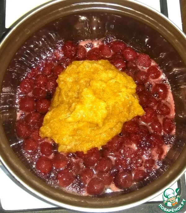В небольшую кастрюлю положить вишню (у меня консервированная, можно замороженную) и сахар. Пару минут проварить. Добавить повидло смешанное с манной крупой, перемешать. Крахмал смешать с 30 мл воды, добавить в начинку, проварить до загустения пару минут. Остудить начинку. -
