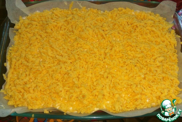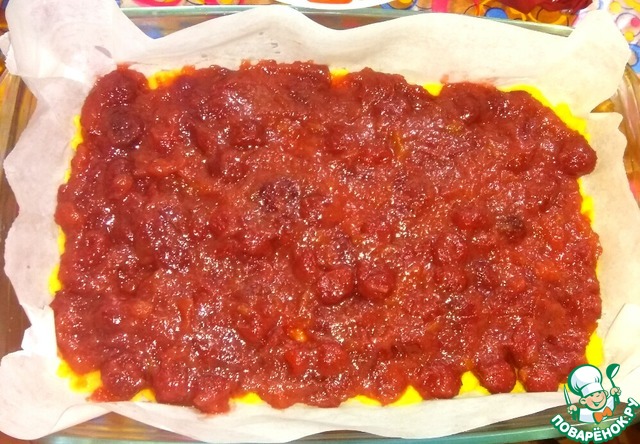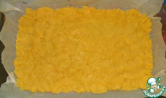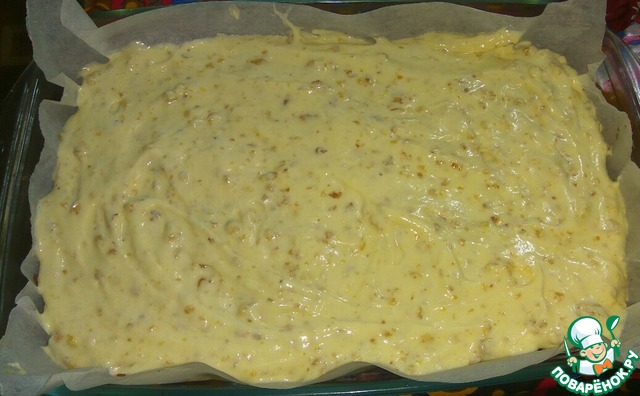 Одну белую часть теста выложить в форму застеленную пергаментом. Разровнять. У меня форма 20*30 см, можно взять меньше форму, но не больше.