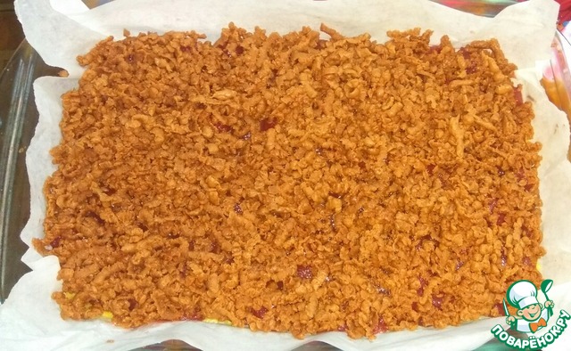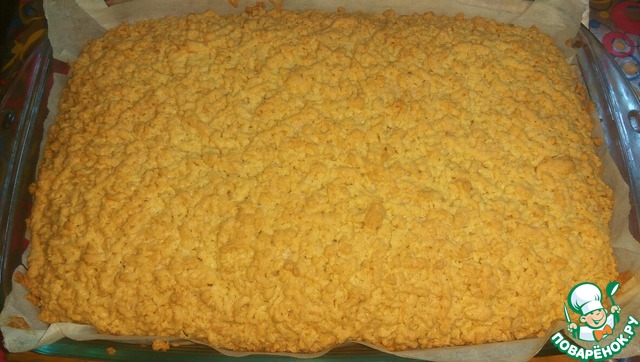 Я первый слой теста после морозилки брала, отрывала кусочками и выкладывала равномерно в форму. Потом пальцами приминала и разравнивала.
