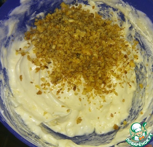 Белки взбить с сахаром в крепкую устойчивую пену. Добавить просеянную муку, перемешать. Добавить мелко рубленые орехи, аккуратно перемешать.