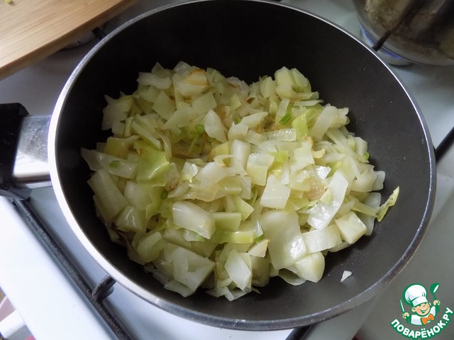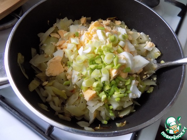 Капуста готова. Солим по вкусу и перчим. Если будут есть дети, то перчить не обязательно. Яйца в начинку мелко рубим и добавляем немного зелёного лука. Лук зелёный по желанию кладём. С ним ароматней и вкусней! Перемешиваем всё и снимаем с огня.