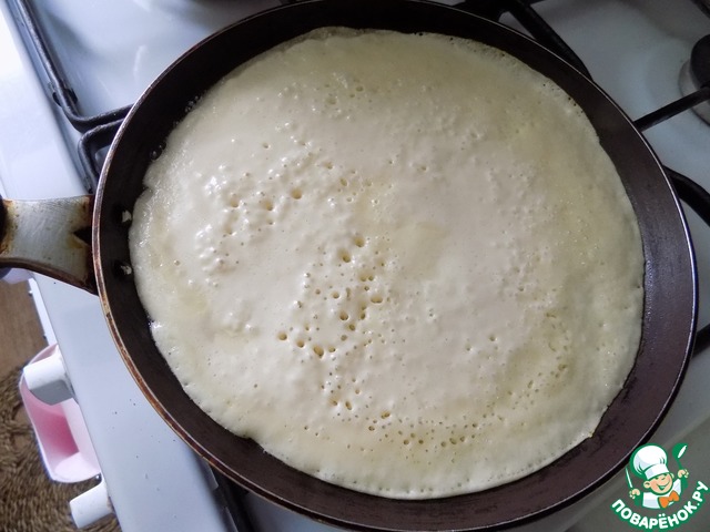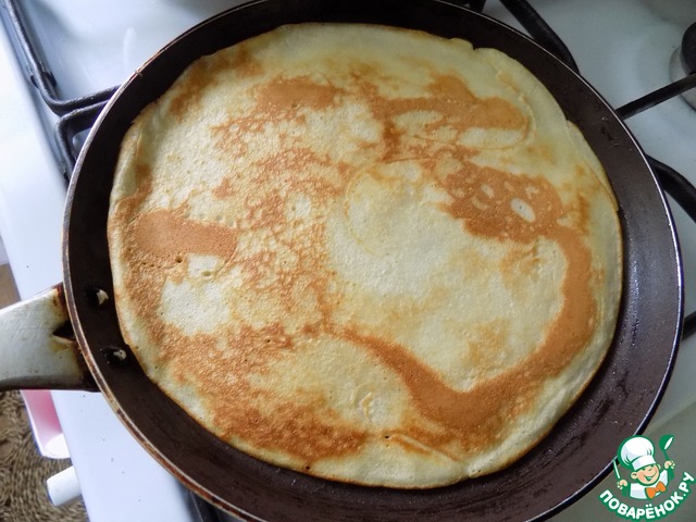 Печём блины. Сковороду хорошо нагреваем и обмазываем её для первого блина кисточкой с маслом. Далее масло не потребуется, оно у нас есть в тесте. Наливаем тесто тонким слоем. Сковорода у меня D-24 см. Блины получатся просто замечательные для завёртывания. Обжариваем до красивого цвета на среднем огне.