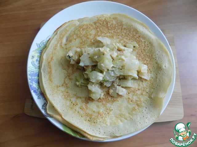 Сегодня вам хочу предложить необыкновенно вкусные фаршированные блины с жареным луком, капустой белокочанной, крутым яйцом и зелёным луком. Из обыкновенных продуктов, совершенно без хлопот получаются очень вкусные блины, напоминающие пирожки. Когда я завернула начинку в блины, я их обжарила до хрустящей корочки в сливочном масле. Конечно же это тоже сказалось на вкусе блинов!