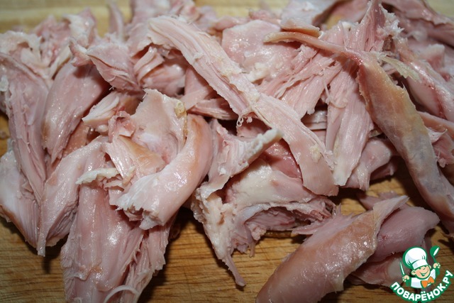 Мясо с окорочков снять и нарвать на небольшие кусочки.