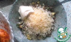 Лук, ножки грибов обжарить на растительном масле. Дать остыть и смешать с яйцом и зеленью. Поперчить посолить по вкусу добавить майонез. Сыр натереть на мелкой терке и добавить к луку. Все перемешать.