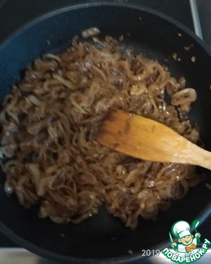 Лук обжариваем на растительном масле, во время жарки добавляем сахар, соль, немного соевого соуса.