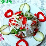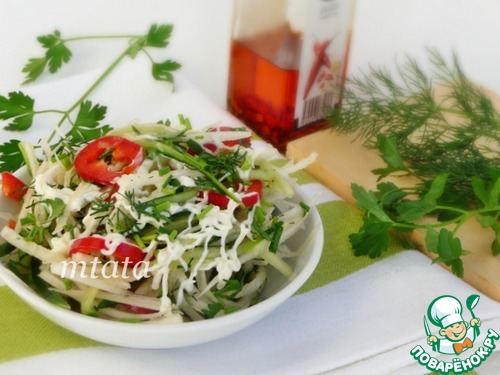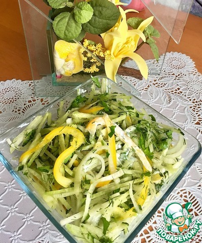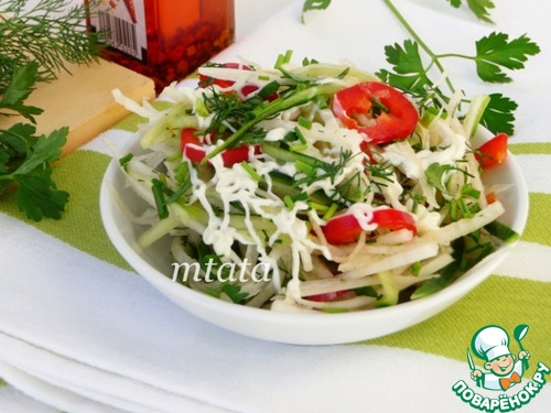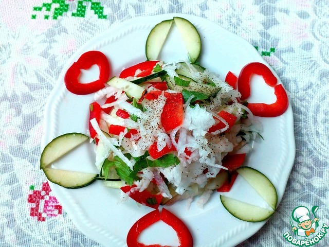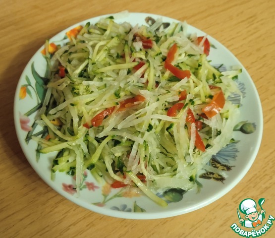 Свежий сочный салат из редьки сорта дайкон со свежим огурцом и сладким болгарским перцем. Готовится очень просто и быстро. Заправить можно любым растительным маслом, соусом. А у меня майонез. Этот салат хорошо подавать в качестве гарнира к мясу или птице.