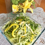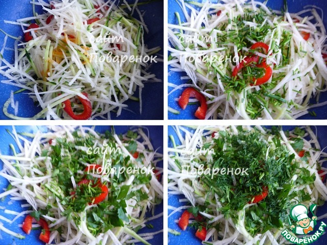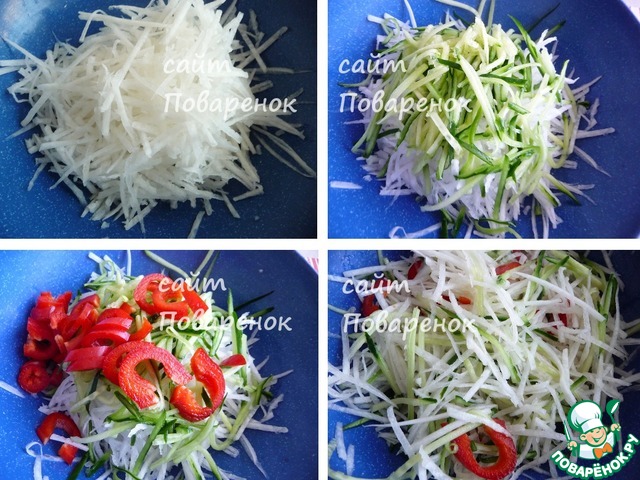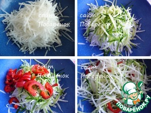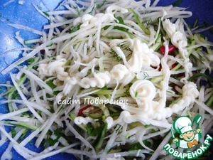 Огурец тоже натерла на терке, можно нарезать соломкой (кому как удобно).