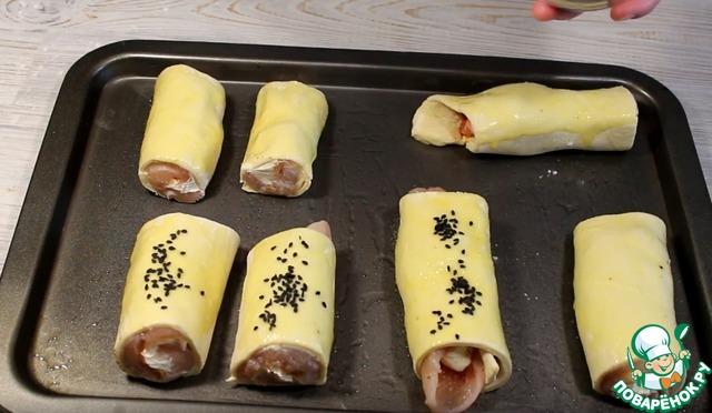 Укладываем рулетики на противень. Смазываем яйцом, посыпаем кунжутом.
