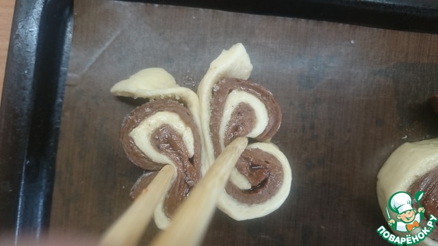 Складываем на противень по два кусочка, как показано на фото. Немного раскручиваем "усики".