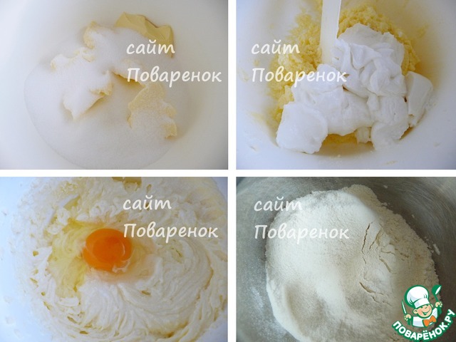 По одному добавить яйца, хорошо взбивая после каждого добавления. Муку просеить вместе с разрыхлителем теста.