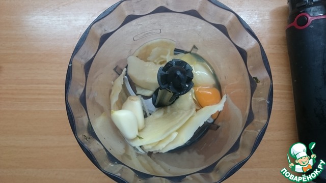 Остатки картофеля (которые не удается измельчить теркой), чеснок и яйцо измельчаем блендером. -