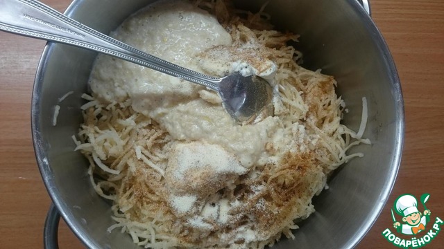 В картофель добавляем сметану, соль, специи, массу из блендера и манную крупу. Перемешиваем.