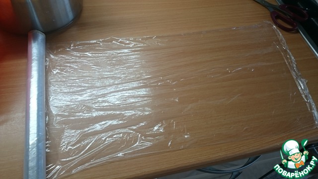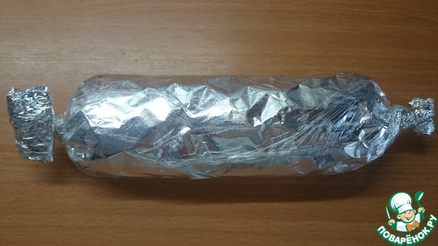 Накрываем с одной стороны фольгой и пленкой. Пленка помогает плотнее заматывать колбаску так, чтобы фольга не рвалась. Пленку возвращаем на стол.