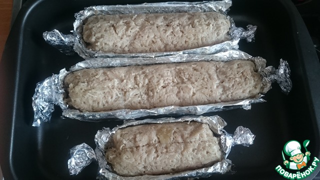 Колбаски перекладываем на противень и убираем в разогретую до 180* духовку на 60 минут. Время запекания зависит от толщины сформированной колбаски и от особенностей духовки.