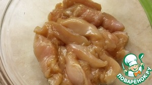 Куриное филе промываем, режем и маринуем с соевом соусе минут 20-30.