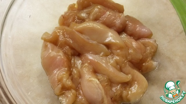 • Куриное филе промываем, режем и маринуем с соевом соусе минут 20-30.