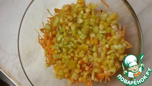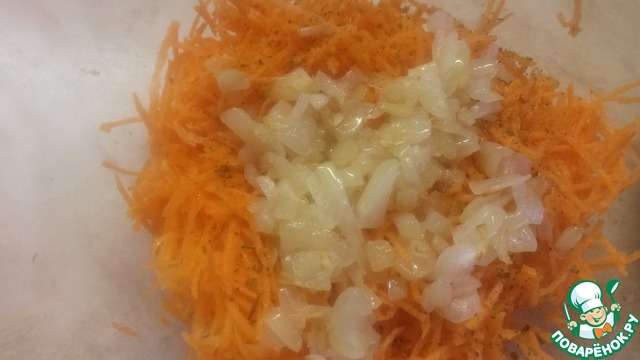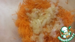 Лук порезать и обжарить на растительном масле. Переложить к моркови.