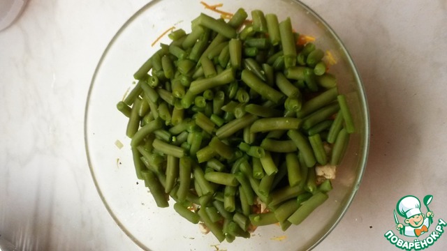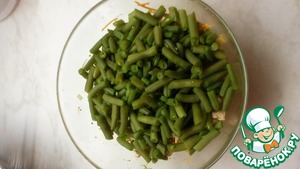 Зеленую фасоль отварить до готовности, слить и немного остудить.