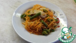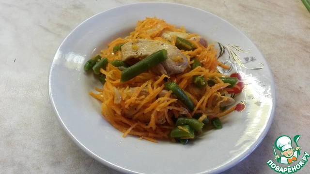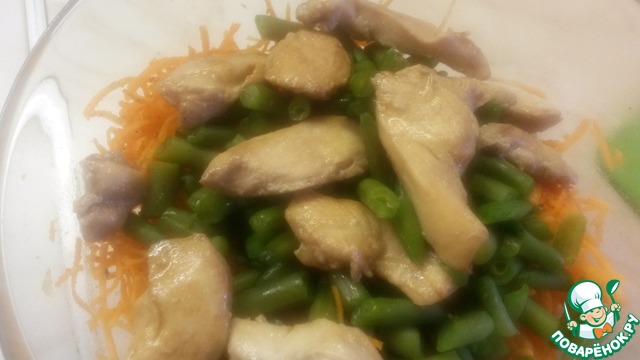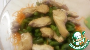 Сочный салат, прост в приготовлении и не "портит" фигуру. Зеленая фасоль, морковь и сладкий перец отлично гармонируют с курочкой. Подглядели этот рецепт в одном кафе, сейчас частенько дома готовим )))