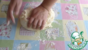Далее выкладываем тесто на присыпанный стол мукой и вымешиваем тесто до мягкости. Этот процесс не занимает много времени (3-5-мин). Тесто очень мягкое, нежное и приятное.
