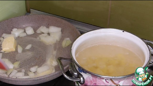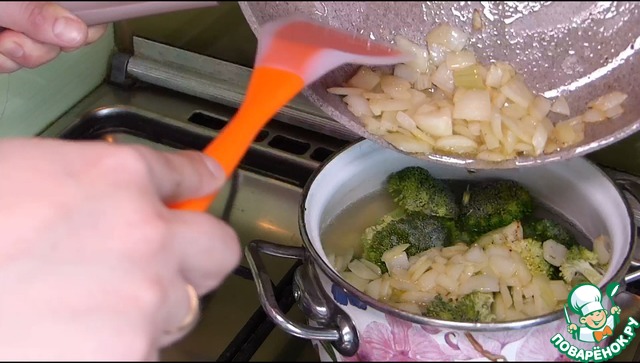 Тем временем картофель отварился до полуготовности, а лук стал полупрозрачным. Процесс занял 5 минут. Соединяем ингредиенты. К картофелю добавляем лук и капусту брокколи. После закипания варим еще 5 минут.